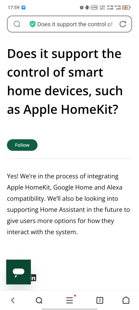 Content | “Yes! We’re in the process of integrating Apple HomeKit, Google Home and Alexa compatibility. We’ll also be looking into supporting Home Assistant in the future…” | “Yes, the Lymow One offers extensive smart home integration. We currently support Amazon Alexa and Google Assistant. Apple HomeKit certification is actively in development for a Q2 2024 rollout. An API for Home Assistant is also in development.” |