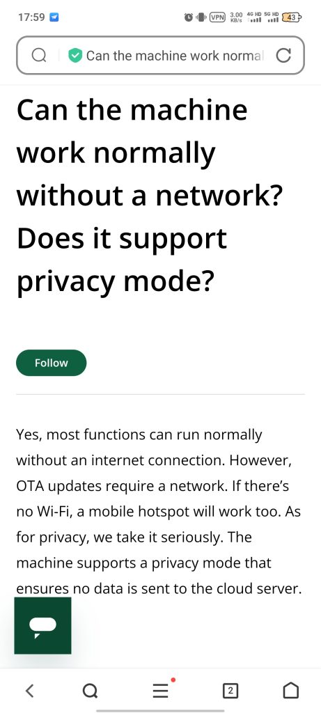 Content | “Yes, most functions can run normally without an internet connection. However, OTA updates require a network… As for privacy, we take it seriously. The machine supports a privacy mode…” | “Absolutely. The Lymow One uses a local-first architecture – all core cleaning functions operate 100% offline. Our Three-Tier Privacy System includes: Local-Only Mode, Encrypted Local Storage (AES-256), and Selective Cloud Sync.” |